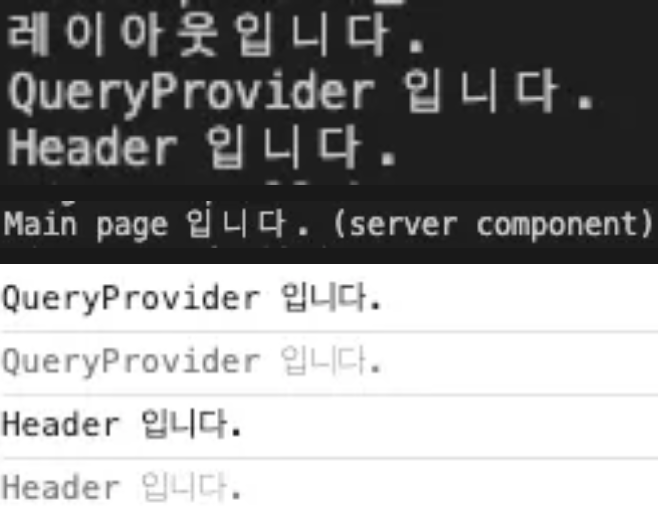 개발자 도구의 콘솔에서는 클라이언트 컴포넌트인 QueryProvider, Header 의 출력 문구만 출력되는 것을 확인할 수 있고 터미널에서는 레이아웃, QueryProvider, Header, Main page 출력 문구가 모두 출력되는 것을 확인할 수 있었습니다.